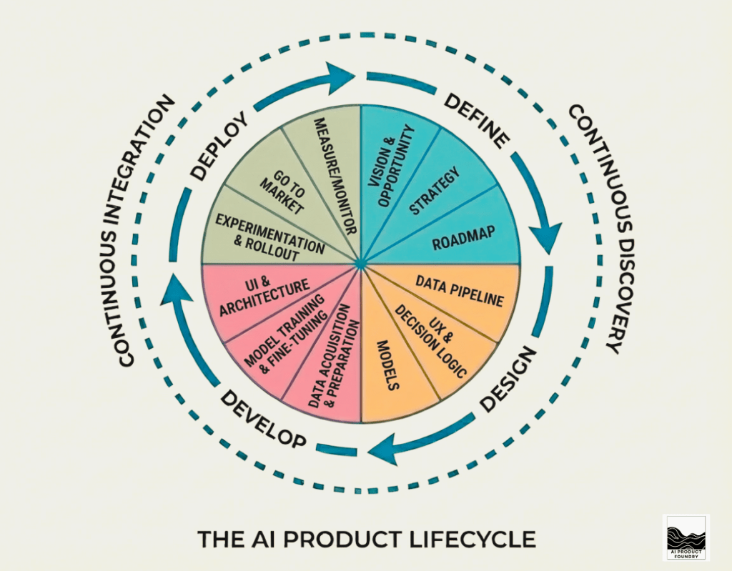 The AI Product Lifecycle defines the iterative process from opportunity definition through continuous integration.