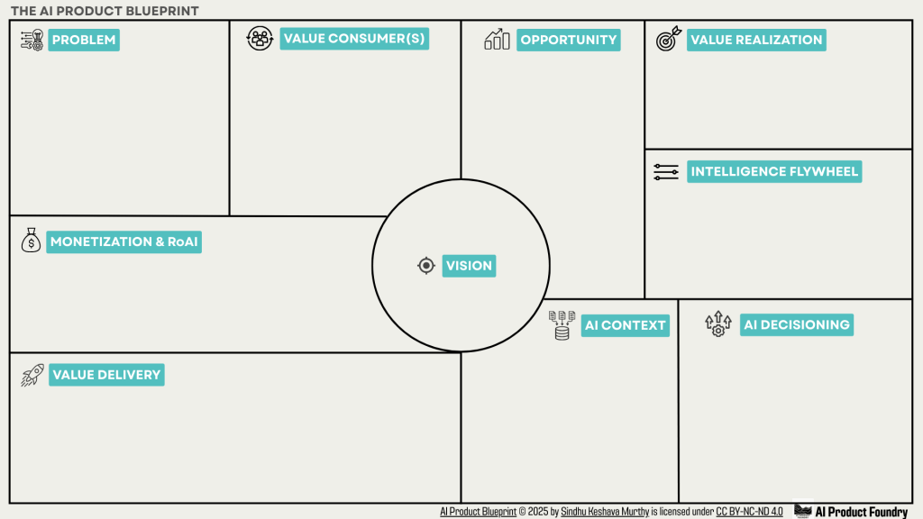 This blueprint deliberately decomposes what is usually labeled “product strategy” into a set of explicit, sequential commitments: the problem worth solving, the value at stake, the outcomes that define success, the operational decisions required to realize that value, and the specific role AI plays in producing intelligence that cannot exist otherwise. It is thoughtfully designed to bake AI right into the product strategy discovery stage without stealing away from the core focus, which is your customers, your business and the value exchange between the two. The goal is not to add process, but to remove ambiguity so that teams don’t mistake technical possibility for strategy or confuse an AI capability with a viable product. The blueprint, once completed, arms you with sufficient clairvoyance to move forward and sufficient confidence to pivot when needed. It’s here not to remove uncertainty, but to make uncertainty more manageable.